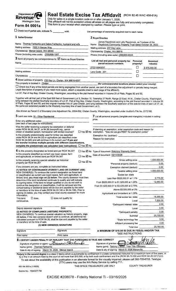 | 4 | 07/01/2020 | SWD | Statutory Warranty Deed | SCOTT JOHN E | CHELAN COUNTY | | | $0.00 | 187241 | 2518975 |