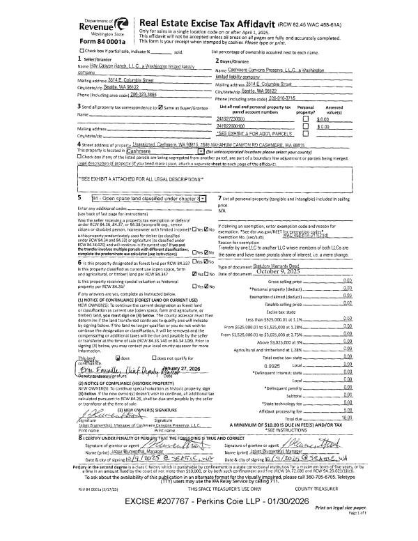 | 1 | 01/30/2026 | SWD | Statutory Warranty Deed | HAY CANYON RANCH LLC | CASHMERE CANYONS PRESERVE LLC | | | $0.00 | 207767 | 2618008 |