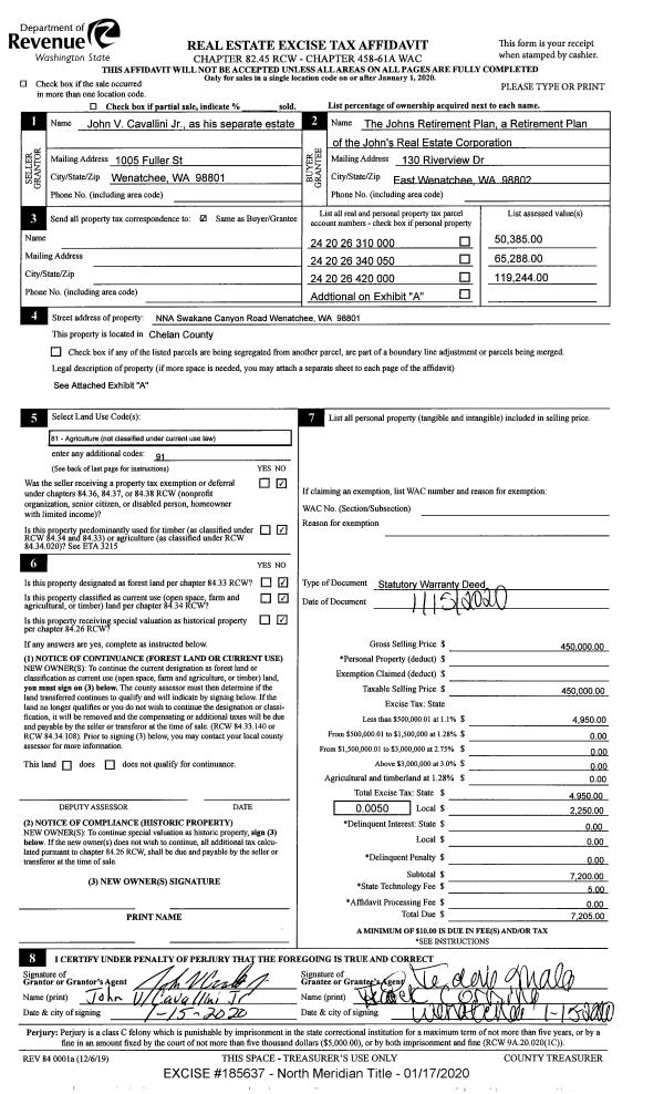 | 5 | 12/04/2019 | SWD | Statutory Warranty Deed | CAVALLINI ORCHARDS LLC | CAVALLINI GWEN L | | | $0.00 | 185223 | 2507254 |