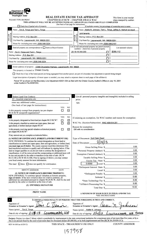 | 5 | 02/26/2013 | Q | Quit Claim Deed | TIMPE TIM E | JOHNSON ADELLE N ETAL | | | $0.00 | 157958 | 2377542 |