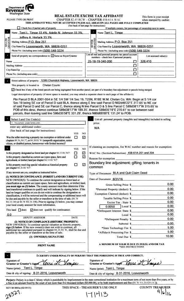 | 3 | 09/06/2016 | Q | Quit Claim Deed | TIMPE TERRI L | JOHNSON ADELLE N ETAL | | | | 171414 | 2443521 BLA |