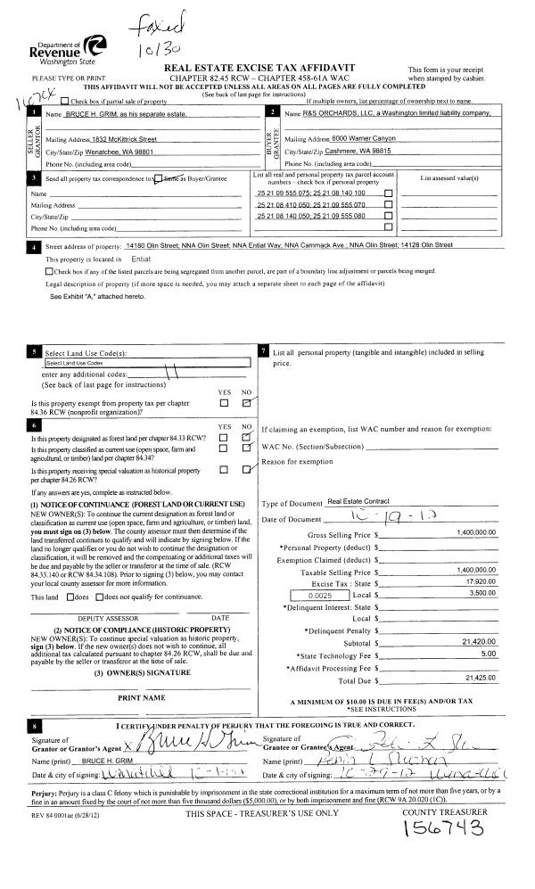 | 3 | 10/30/2012 | C | Real Estate Contract | GRIM BRUCE H | R&S ORCHARDS LLC | | | $1,400,000.00 | 156743 | 2370764 |