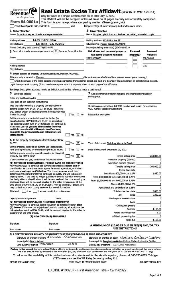| 4 | 05/21/2016 | SWD | Statutory Warranty Deed | ROSE NORMAN T & MARY E | KINGSTON LLC | | | $1,000.00 | 170023 | *2437094 |