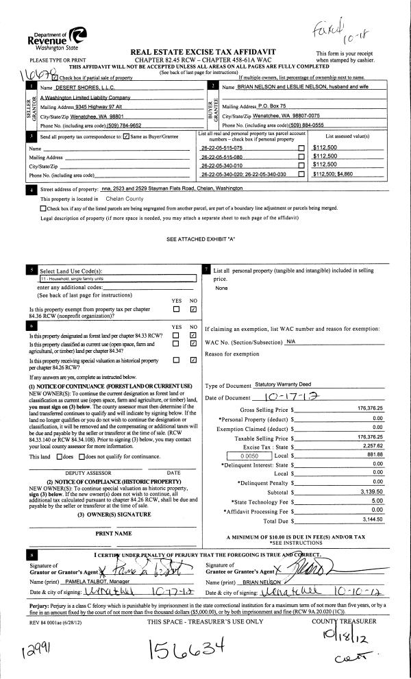 | 3 | 10/18/2012 | SWD | Statutory Warranty Deed | DESERT SHORES LLC & BRIAN & LESLIE NELSON | NELSON BRIAN & LESLIE | | | $176,376.00 | 156634 | 2370071 |