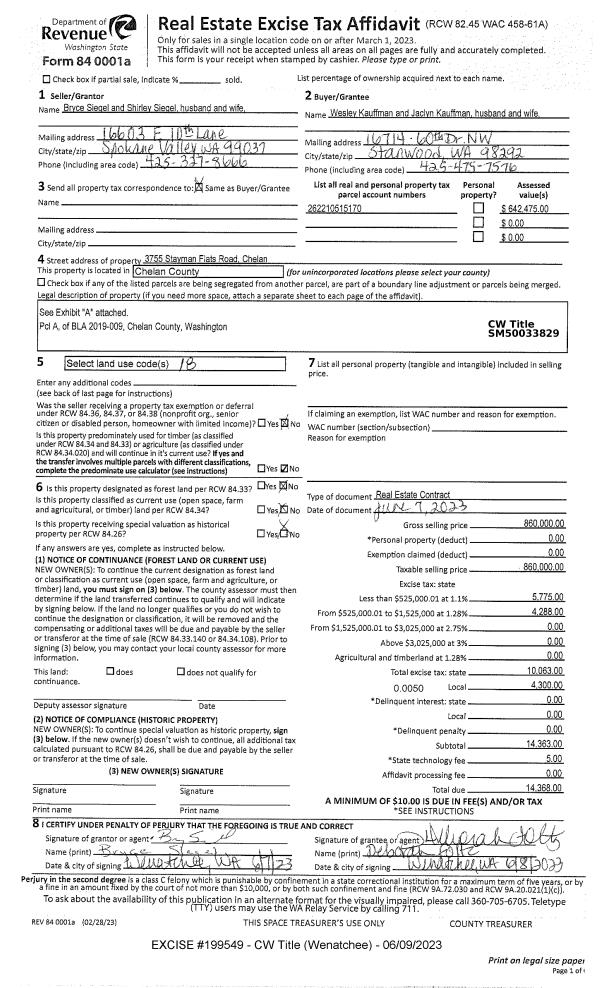 1 | 06/09/2023 | C | Real Estate Contract | SIEGEL BRYCE & SHIRLEY | KAUFFMAN WESLEY & JACLYN | | | $860,000.00 | 199549 | 2582420 |