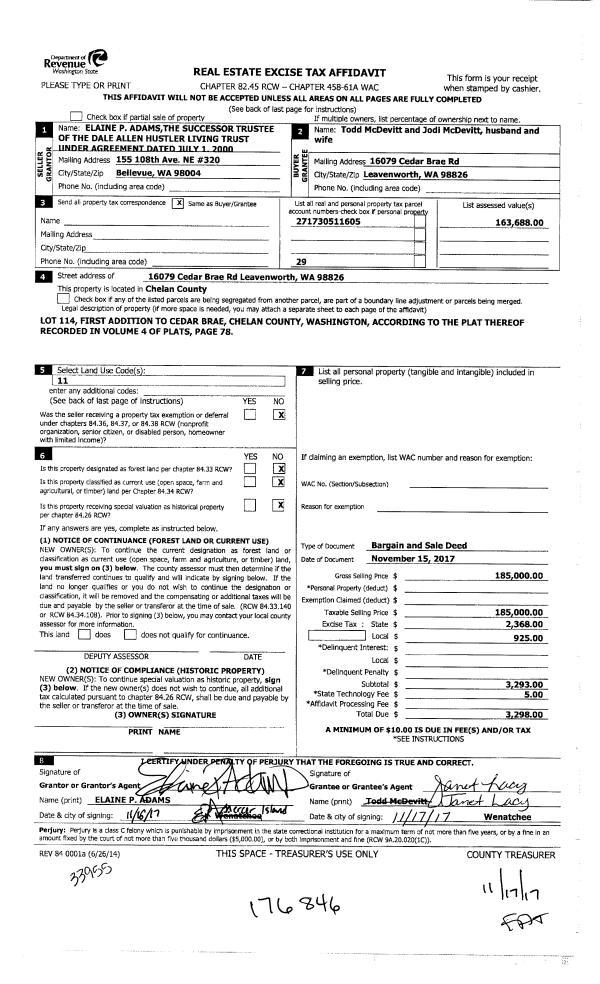 | 2 | 11/17/2017 | BARGAIN | Bargain & Sale Deed | HUSTLER DALE ALLEN TRUST | MC DEVITT TODD R & JODI B | | | $185,000.00 | 176846 | 2468955 |