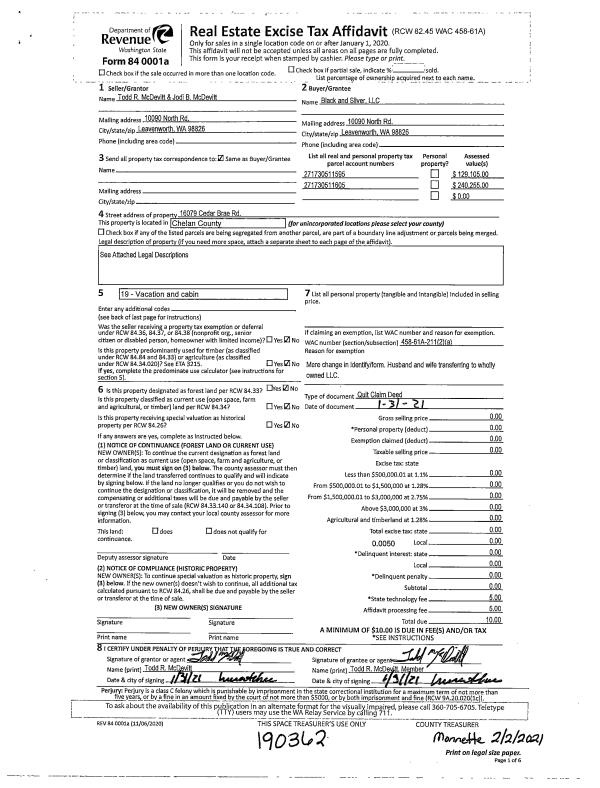| 1 | 02/02/2021 | Q | Quit Claim Deed | MC DEVITT TODD R & JODI B | BLACK & SILVER LLC | | | $0.00 | 190362 | 2535823 |