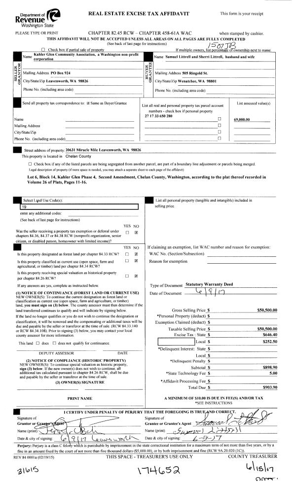 | 3 | 06/15/2017 | SWD | Statutory Warranty Deed | KAHLER GLEN COMMUNITY ASSOCIATION | LITTRELL SAMUEL E & SHERRI L | | | $50,500.00 | 174652 | 2459264 |