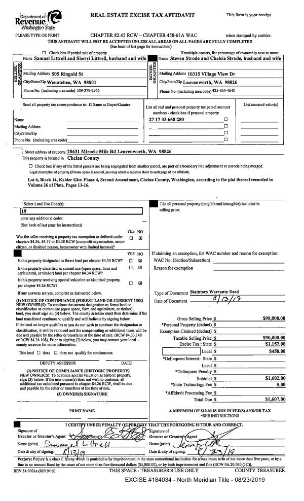 | 2 | 08/23/2019 | SWD | Statutory Warranty Deed | LITTRELL SAMUEL E & SHERRI L | STRODE STEVEN E & CHELCIE R | | | $90,000.00 | 184034 | 2501304 |