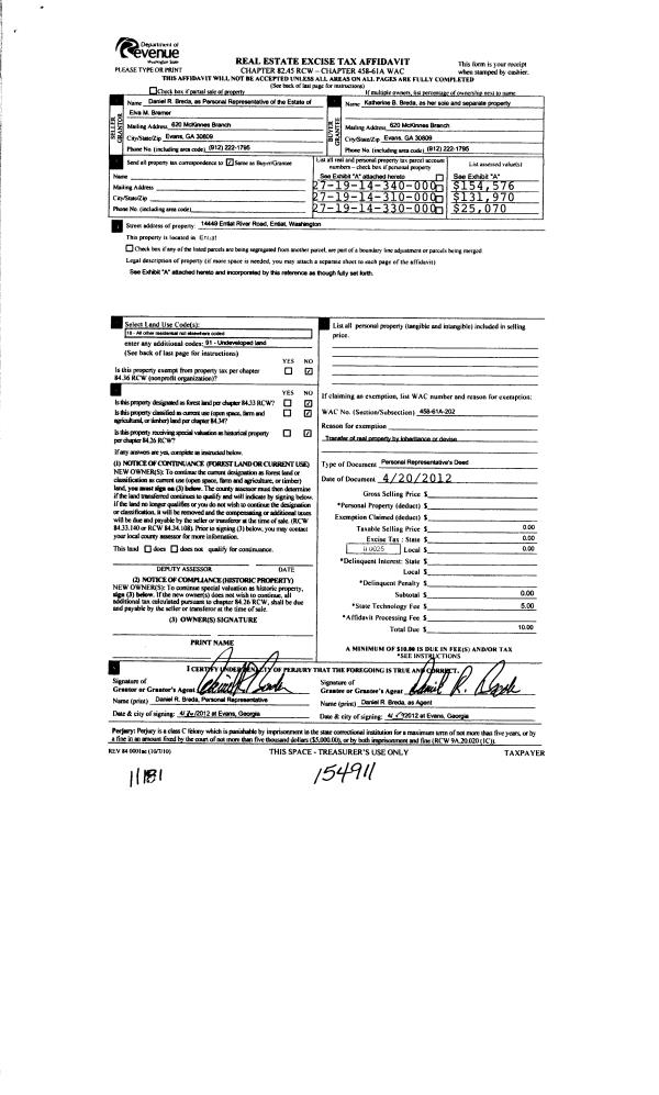 | 7 | 04/30/2012 | PR | Personal Representatives Deed | BREMER ELVA M | BREDA KATHERINE BREMER | | | $0.00 | 154911 | 2359968 |