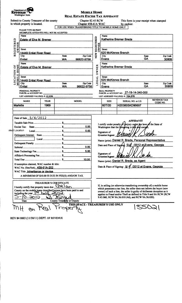 | 8 | 05/10/2012 | MH TITLE | Mobile Home Title | BREMER ELVA M | BREDA KATHERINE BREMER | | | | 155021 | |