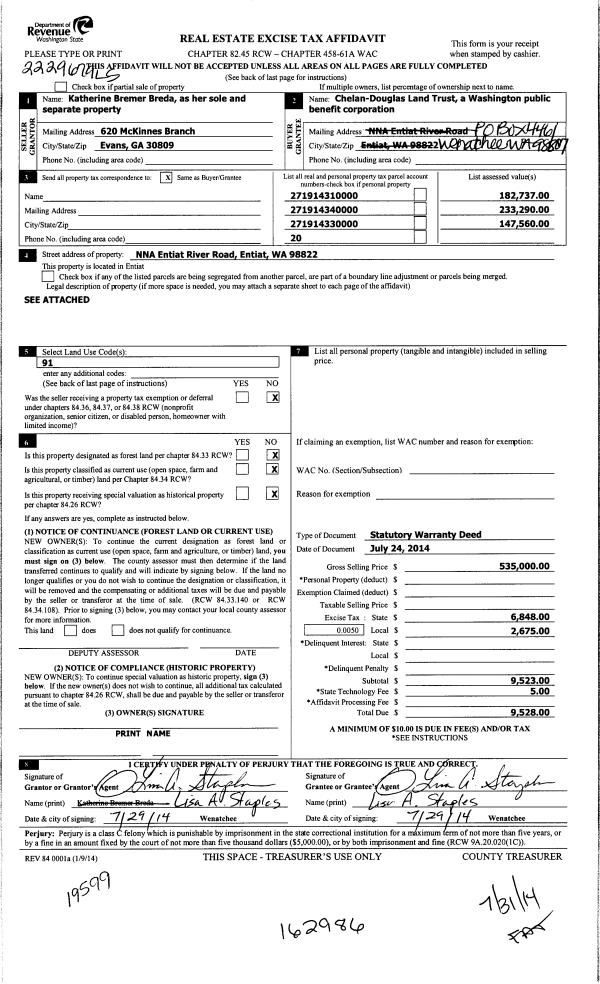 | 4 | 07/31/2014 | SWD | Statutory Warranty Deed | BREDA KATHERINE BREMER | CHELAN-DOUGLAS LAND TRUST | | | $535,000.00 | 162986 | 2404039 |