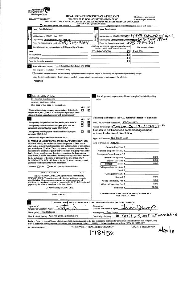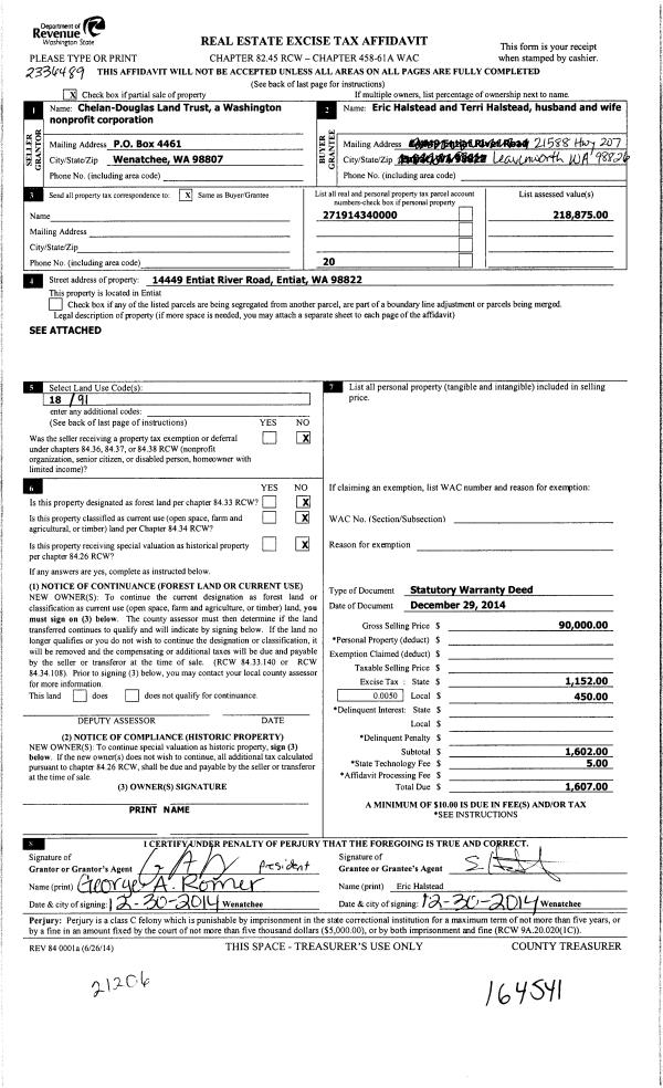| 3 | 12/31/2014 | SWD | Statutory Warranty Deed | CHELAN-DOUGLAS LAND TRUST | HALSTEAD ERIC & TERRI | | | $90,000.00 | 164541 | 2411528 |