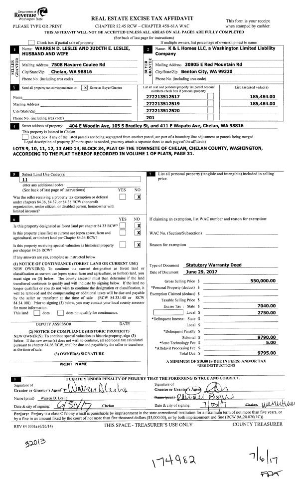 1 | 07/11/2017 | SWD | Statutory Warranty Deed | LESLIE WARREN D | K & L HOMES LLC | | | $550,000.00 | 174982 | 2460581 |
