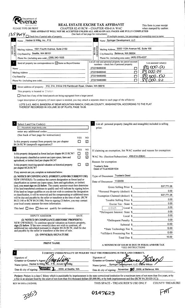 | 3 | 12/04/2009 | TD | Trustee Deed | GREAT NORTHERN LAND CO LLC | SPRINGER DEVELOPMENT LLC | | | $0.00 | 147629 | 2315522 |