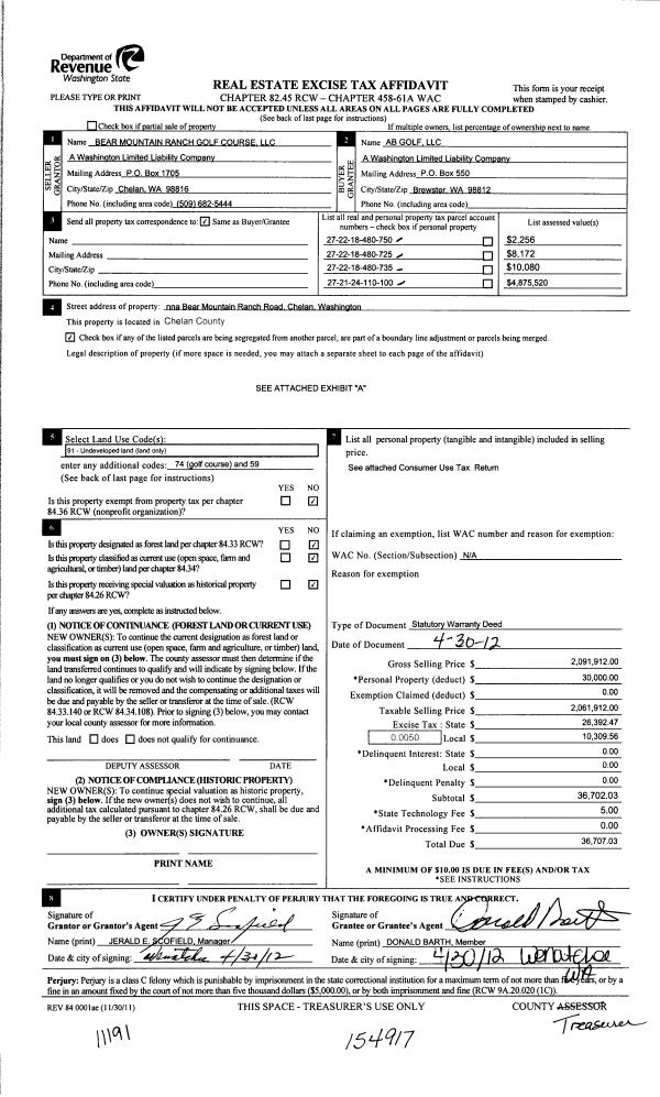 | 1 | 05/01/2012 | SWD | Statutory Warranty Deed | BEAR MOUNTAIN RANCH GOLF COURSE | AB GOLF LLC | | | $2,061,912.00 | 154917 | 2360038 |