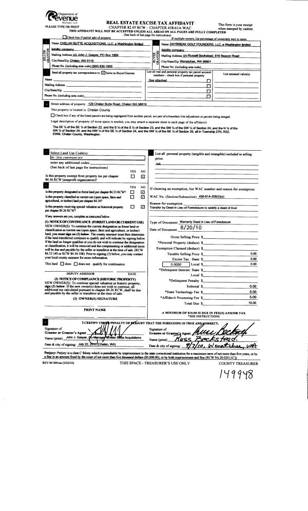| 3 | 09/10/2010 | W | Warranty Deed | CHELAN BUTTE ACQUISITION LLC | DAYBREAK GOLF FOUNDERS LLC | | | | 149948 | 2329415 |