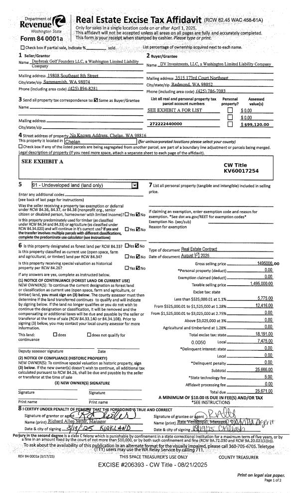 | 1 | 08/21/2025 | C | Real Estate Contract | DAYBREAK GOLF FOUNDERS LLC | DV INVESTMENTS LLC | | | $1,495,000.00 | 206393 | 2611729 |