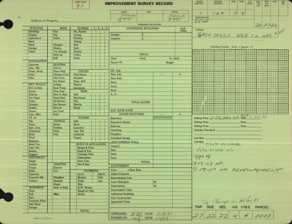 | 6 | 03/24/1994 | SWD | Statutory Warranty Deed | | SNOWCREEK DEVELOPEMENT CO INC | 1016 | 1457 | $1,250,000.00 | 8047502 | |