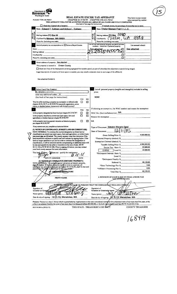 2 | 12/11/2015 | SWD | Statutory Warranty Deed | ECKBERG EDWARD T & ARDYCE L | CHELAN MANSON FRUIT II LLC | | | $4,500,000.00 | 168419 | 2429828 |