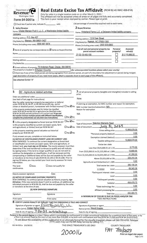 1 | 07/31/2023 | SWD | Statutory Warranty Deed | CHELAN MANSON FRUIT II LLC | HINTERLAND FARMS TRS LLC | | | $13,868,678.00 | 200016 | 2584384 |