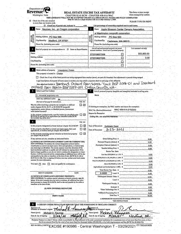 | 1 | 03/29/2021 | Q | Quit Claim Deed | NAUMES INC | APPLE BLOSSOM CENTER OWNERS ASSOC | | | $0.00 | 190986 | 2540006 |