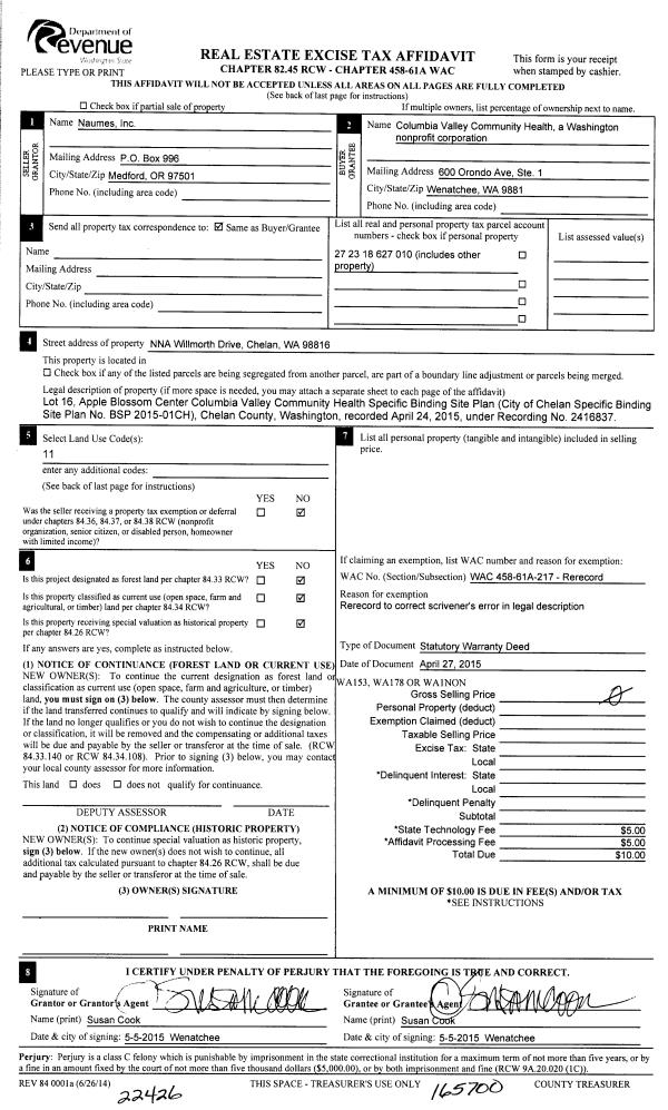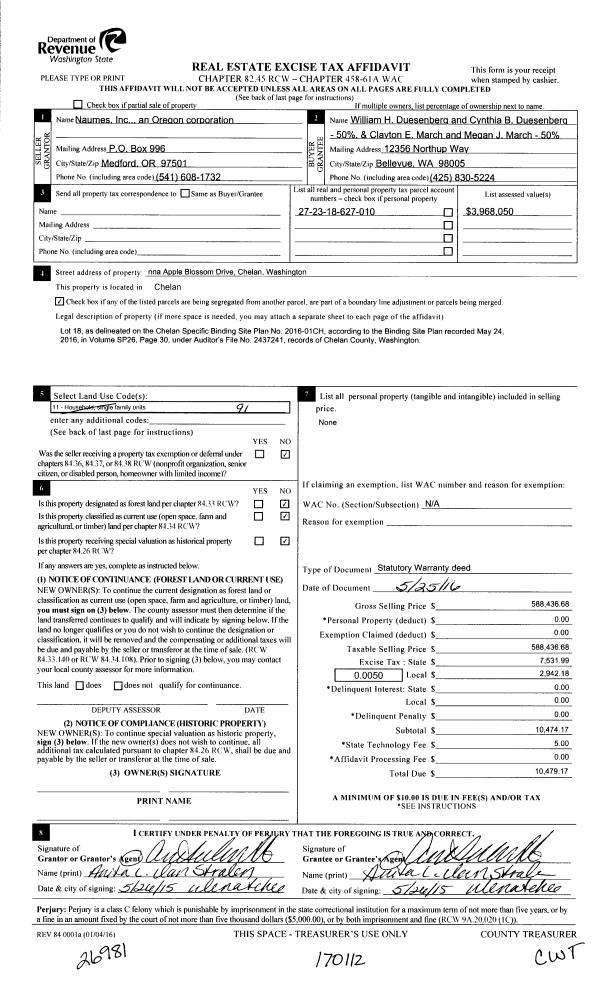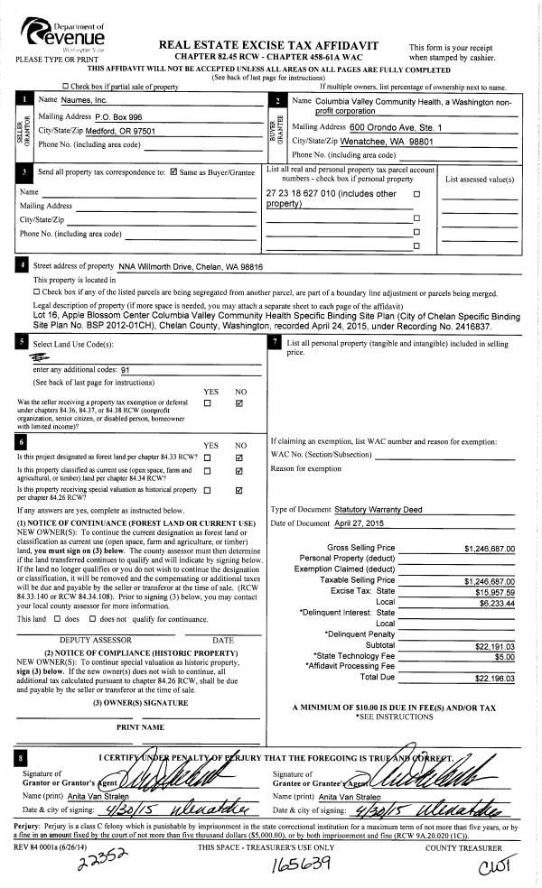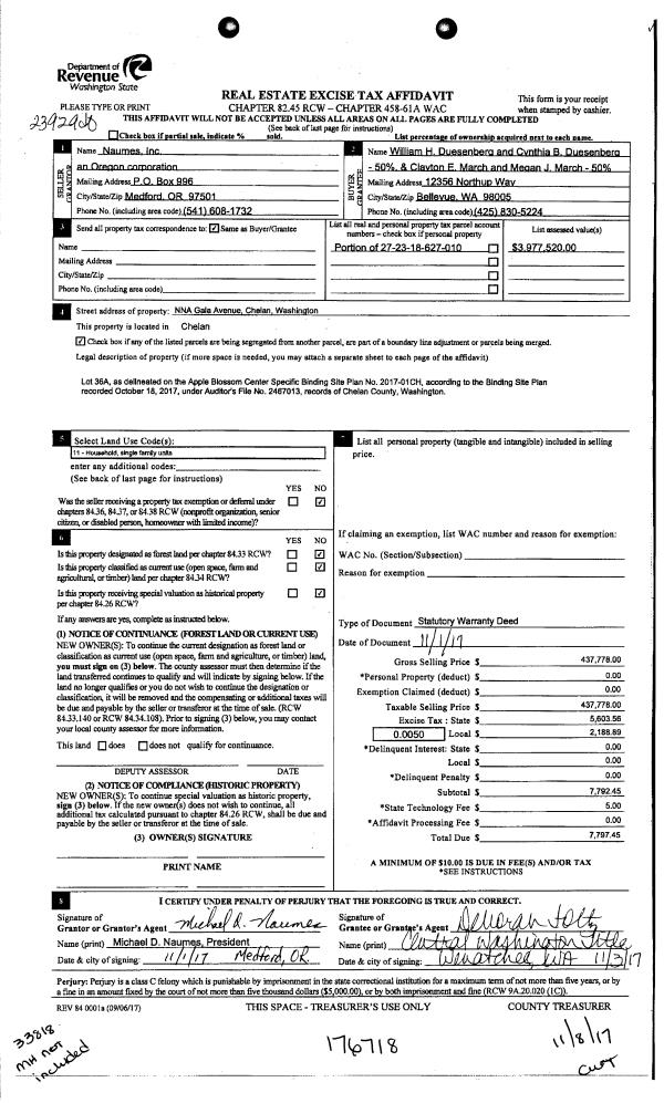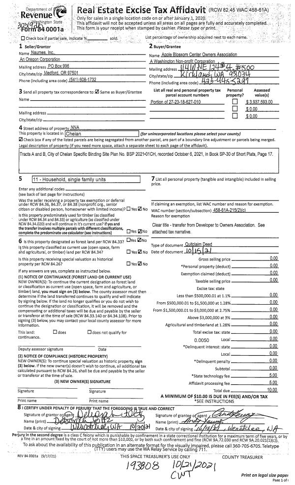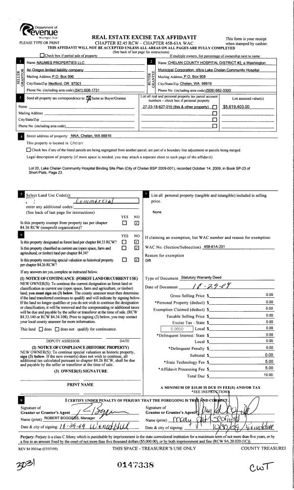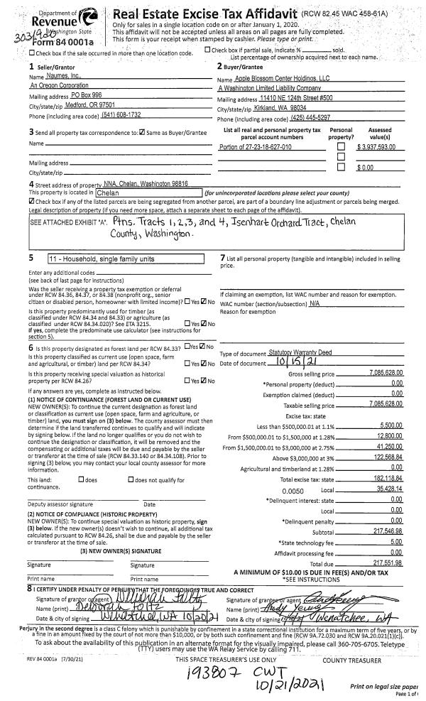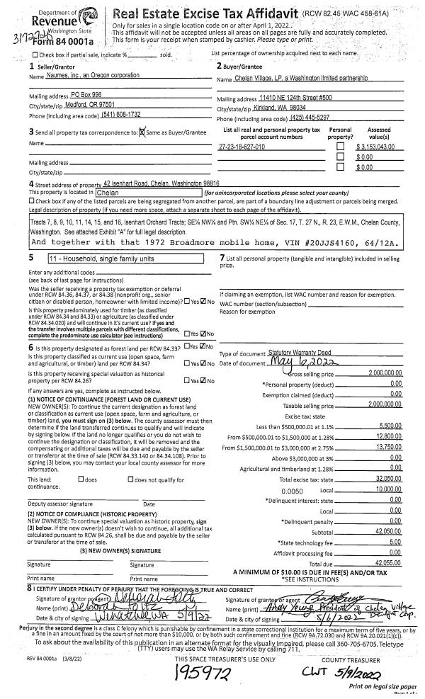 | 1 | 05/09/2022 | SWD | Statutory Warranty Deed | NAUMES INC | CHELAN VILLAGE LP | | | $2,000,000.00 | 195972 | 2566855 |