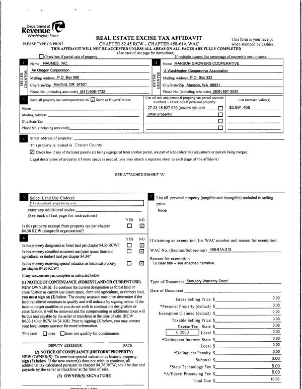 | 5 | 12/04/2012 | SWD | Statutory Warranty Deed | MANSON GROWERS CO-OP INC | NAUMES INC | | | | 157084 | 2372700 BSP |