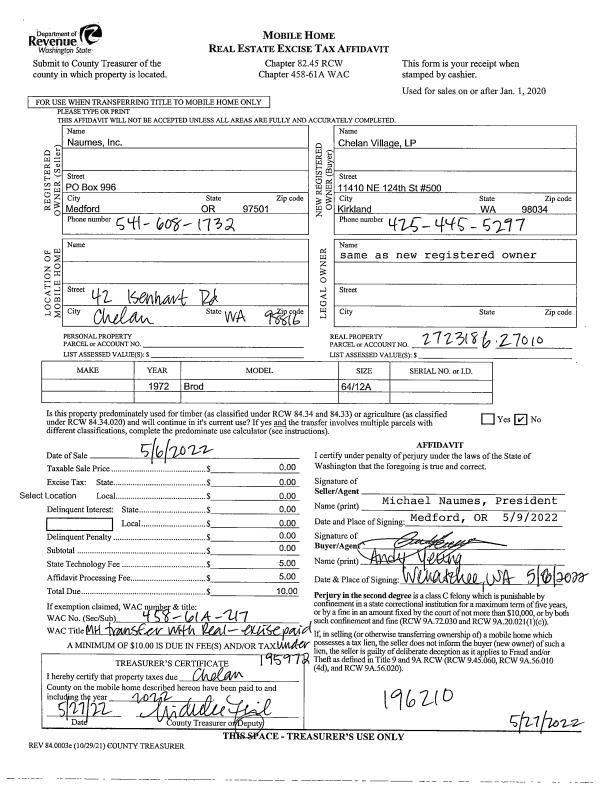 | 3 | 05/27/2022 | MH TITLE | Mobile Home Title | NAUMES INC | CHELAN VILLAGE LP | | | | 196210 | |