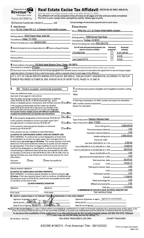 | 1 | 06/10/2022 | SWD | Statutory Warranty Deed | 6S ORLY CHELAN WA LLC | WHITE DOG LLC | | | $2,906,420.00 | 196374 | 2568642 |