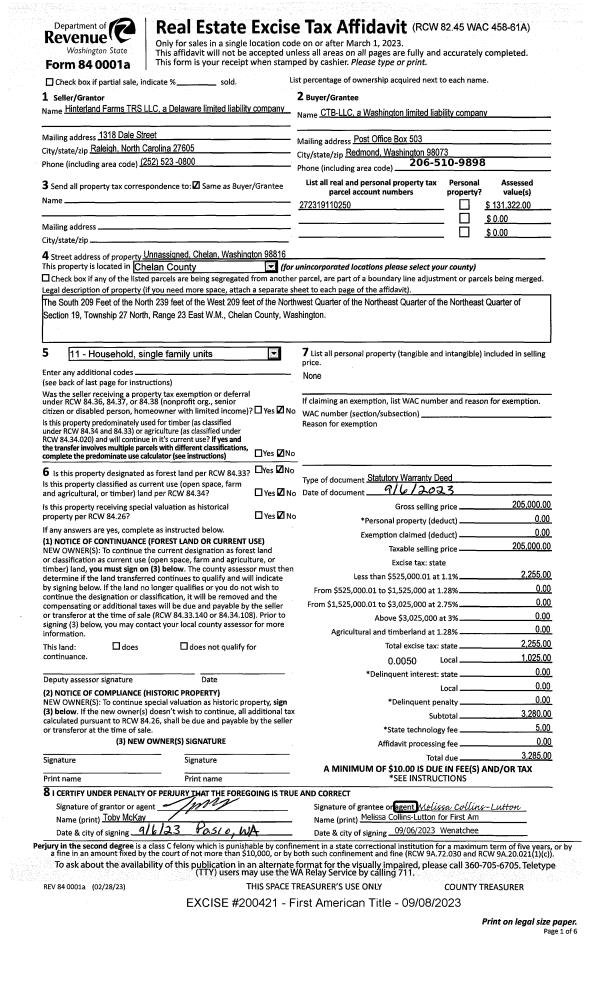 1 | 09/08/2023 | SWD | Statutory Warranty Deed | HINTERLAND FARMS TRS LLC | CTB LLC | | | $205,000.00 | 200421 | 2585960 |