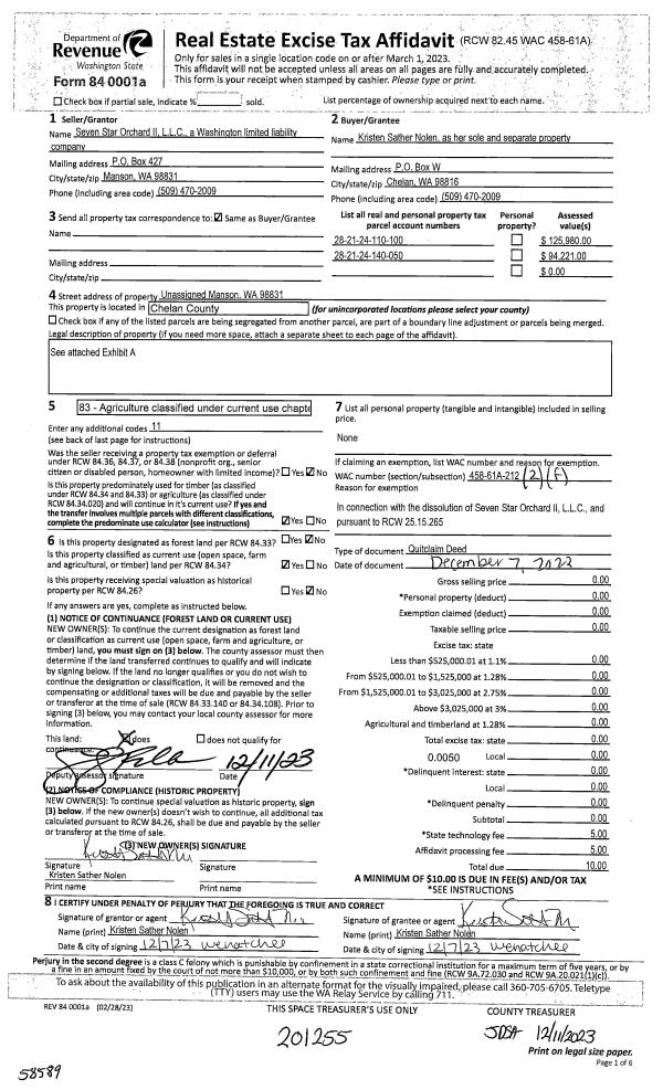 | 2 | 12/11/2023 | Q | Quit Claim Deed | SEVEN STAR ORCHARD II LLC | SATHER NOLEN KRISTEN | | | $0.00 | 201255 | 2589323 |