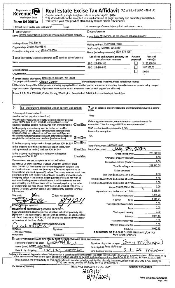 | 1 | 07/24/2024 | Q | Quit Claim Deed | SATHER NOLEN KRISTEN | MCPHERSON ANNE | | | $223,342.00 | 203161 | 2597568 |