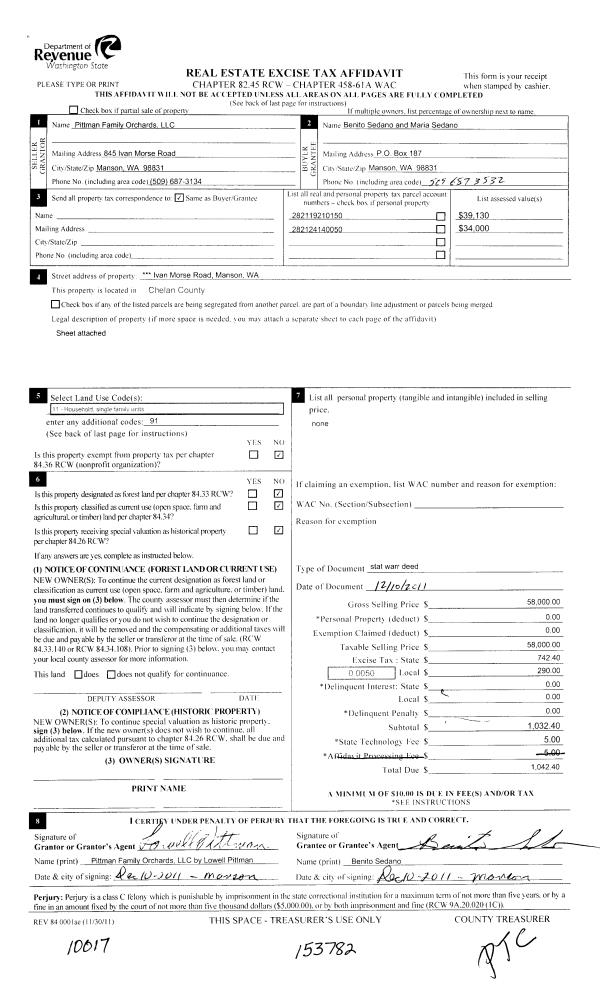 5 | 12/14/2011 | SWD | Statutory Warranty Deed | PITTMAN FAMILY ORCHARD LLC | SEDANO BENITO & MARIA | | | $58,000.00 | 153782 | 2353288 |