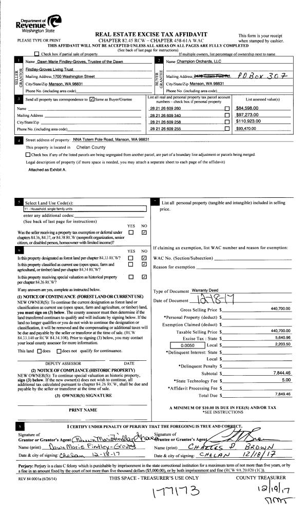 | 1 | 12/19/2017 | WD | Warranty Deed | FINDLEY-GROVES DAWN MARIE TRT | CHAMPION ORCHARDS LLC | | | $440,700.00 | 177173 | 2470577 |