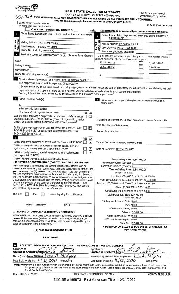 | 1 | 10/21/2020 | SWD | Statutory Warranty Deed | IVERSEN SVERRE ETAL | STEPHENS RICHARD B & TERRY D BEENE STEPHENS | | | $1,845,000.00 | 188973 | 2527697 |