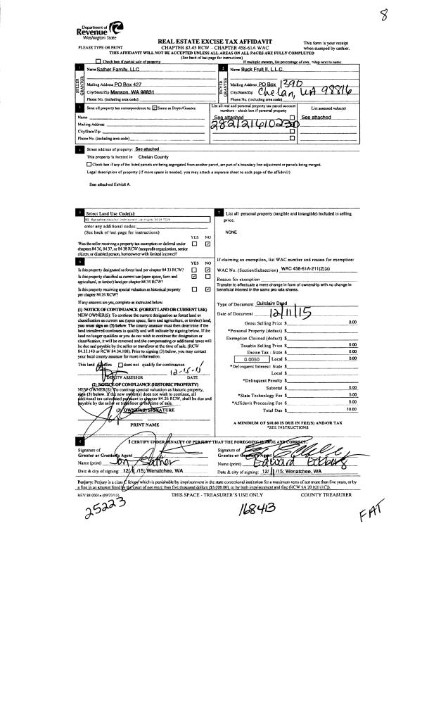 | 5 | 12/15/2015 | Q | Quit Claim Deed | BUCK FRUIT LLC | SATHER FAMILY LLC ETAL | | | $0.00 | 168412 | 2429810 |