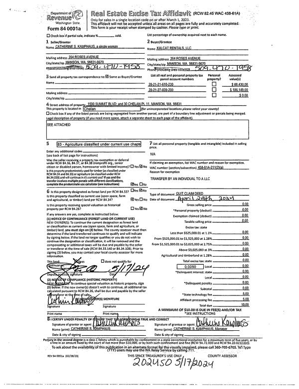 | 1 | 05/17/2024 | Q | Quit Claim Deed | KAMPHAUS CATHERINE S | KALCAT RENTALS LLC | | | $0.00 | 202450 | 2594265 |