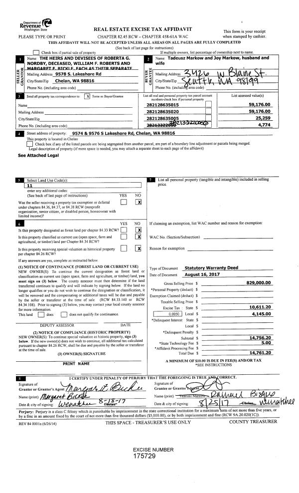 | 1 | 08/25/2017 | SWD | Statutory Warranty Deed | NORDBY ROBERTA G ETAL | MARKOW TADEUSZ & JOY | | | $829,000.00 | 175729 | 2463762 |