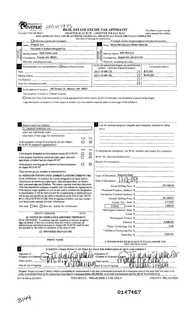 | 1 | 11/13/2009 | WD | Warranty Deed | FOX PHILLIP B | MCCABE MARYA & WILLIAM BABONAS | | | $337,000.00 | 147467 | 2314480 |