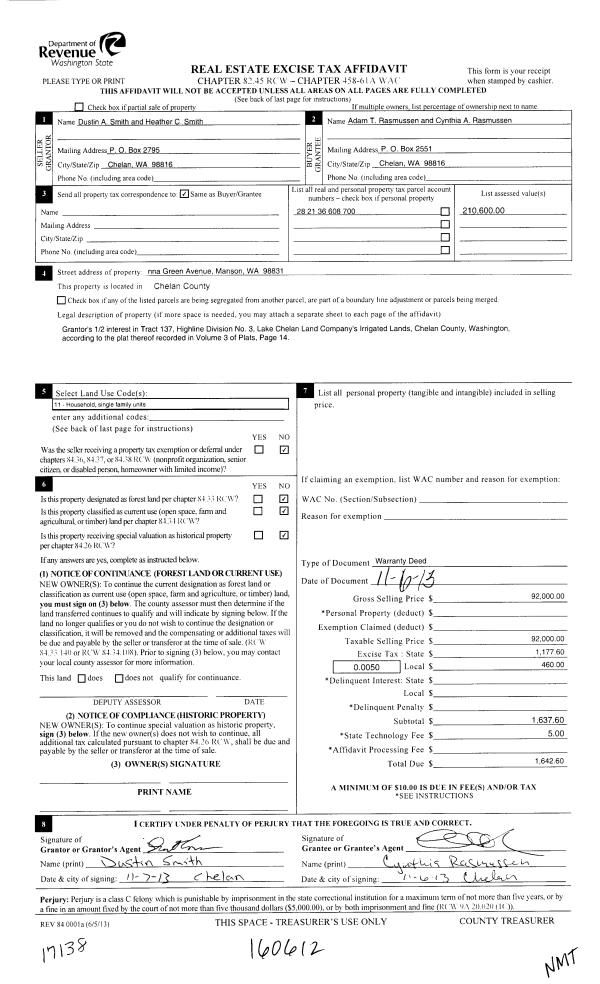 | 3 | 11/08/2013 | WD | Warranty Deed | SMITH DUSTIN A & HEATHER C | RASMUSSEN ADAM T & CYNTHIA A | | | $92,000.00 | 160612 | 2392623 |