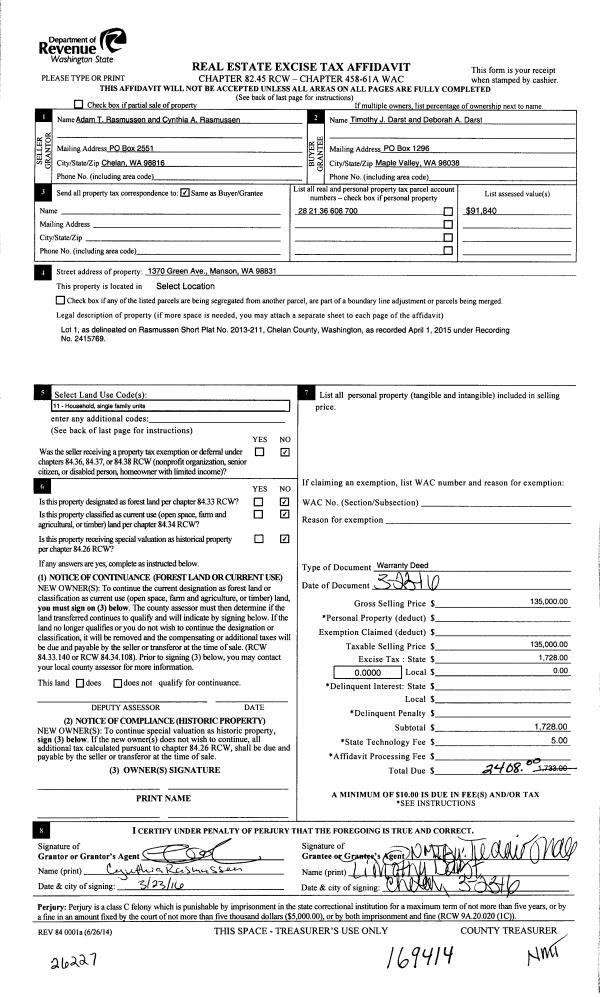 | 2 | 03/25/2016 | W | Warranty Deed | RASMUSSEN ADAM T & CYNTHIA A | DARST TIMOTHY J & DEBORAH A | | | $135,000.00 | 169414 | 2434341 |
