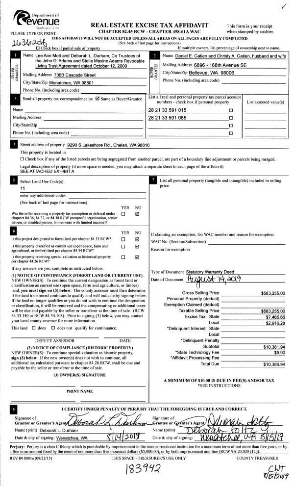 | 2 | 12/15/2015 | SWD | Statutory Warranty Deed | GREEN'S LANDING LLC | CHELAN VALLEY ORCHARDS II LLC | | | $1,090,500.00 | 168417 | 2429823 |
