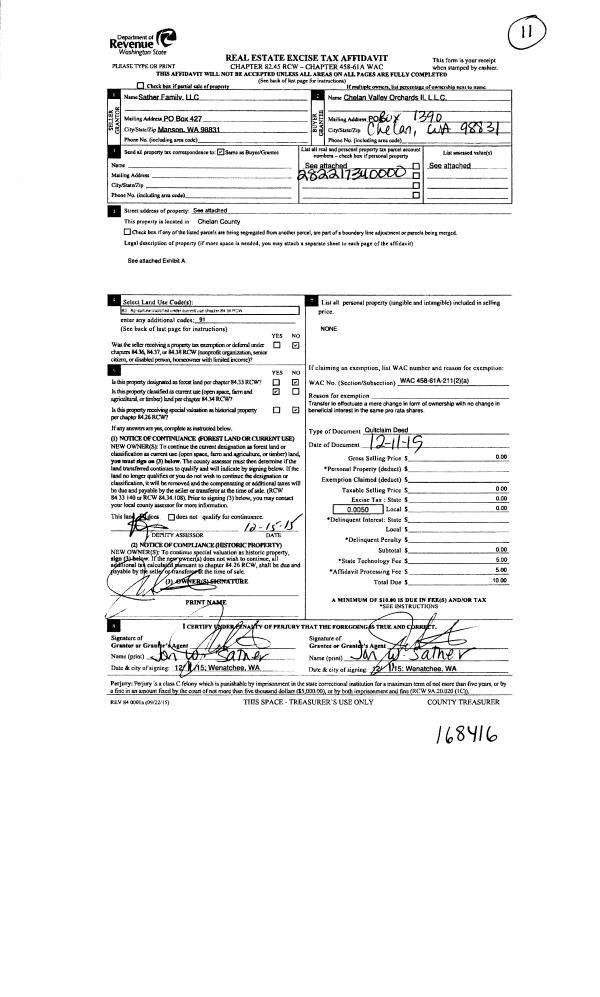 | 3 | 12/15/2015 | Q | Quit Claim Deed | SATHER FAMILY LLC | CHELAN VALLEY ORCHARDS II LLC | | | $0.00 | 168416 | 2429822 |