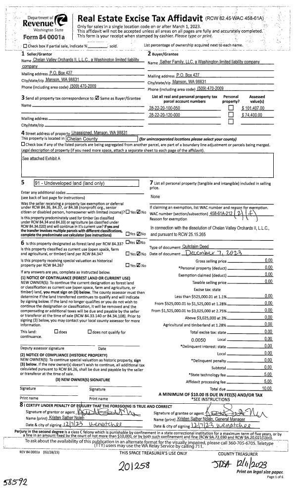 | 1 | 12/11/2023 | Q | Quit Claim Deed | CHELAN VALLEY ORCHARDS II LLC | SATHER FAMILY LLC | | | $0.00 | 201258 | 2589328 |