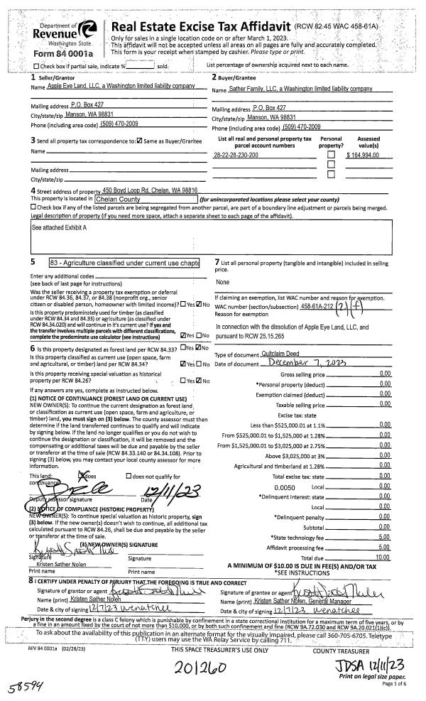 1 | 12/11/2023 | Q | Quit Claim Deed | APPLE EYE LAND LLC | SATHER FAMILY LLC | | | $0.00 | 201260 | 2589331 |