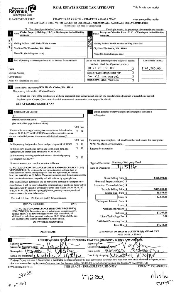 | 3 | 11/17/2016 | SWD | Statutory Warranty Deed | CHELAN PROPERTY HOLDINGS LLC | PEREGRINE COLUMBIA RIVER LLC | | | $405,000.00 | 172301 | 2448030 |