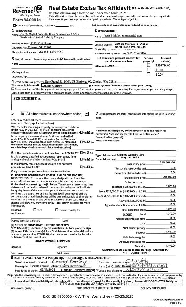 | 1 | 05/23/2025 | SWD | Statutory Warranty Deed | GORILLA CAPITAL COLUMBIA RIVER DEVELOPMENT LLC | BABITSKY JUSTIN | | | $275,000.00 | 205553 | 2608057 |