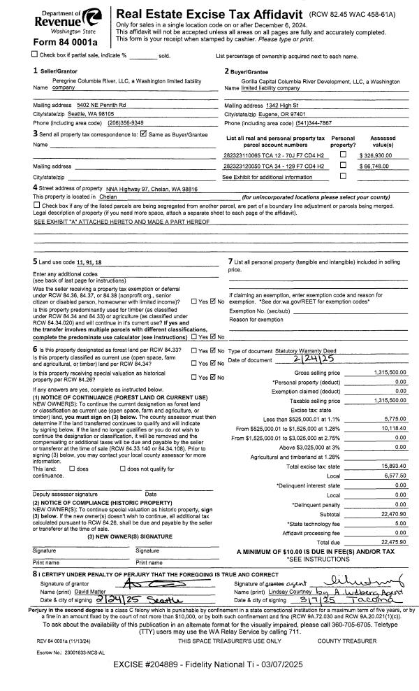 | 2 | 03/07/2025 | SWD | Statutory Warranty Deed | PEREGRINE COLUMBIA RIVER LLC | GORILLA CAPITAL COLUMBIA RIVER DEVELOPMENT LLC | | | $1,315,500.00 | 204889 | 2605168 |