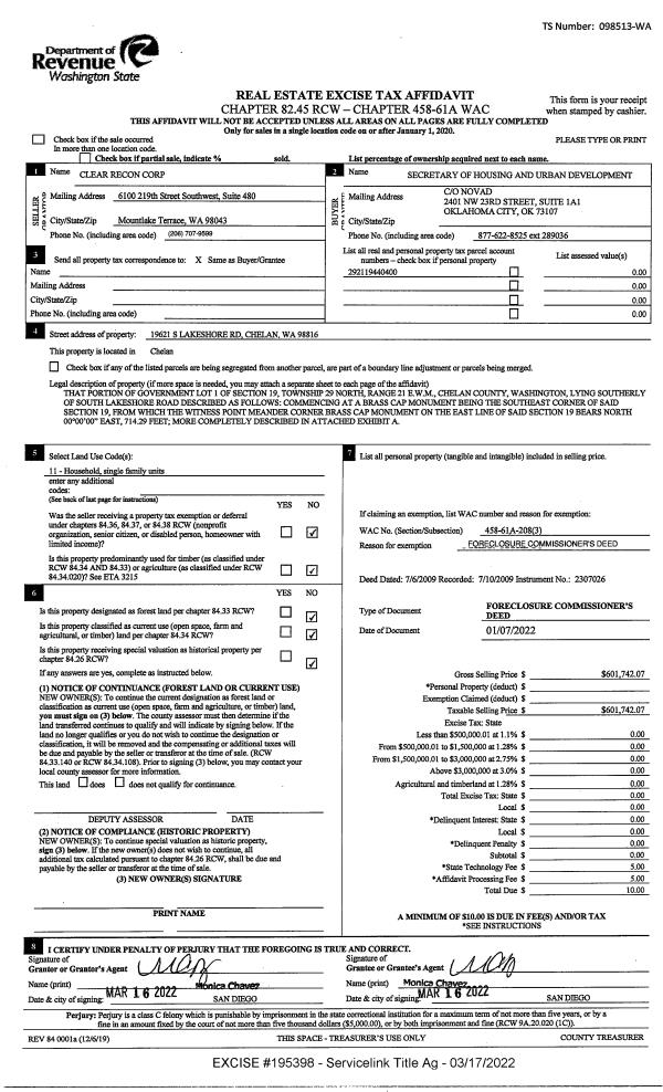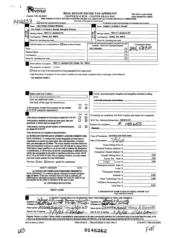 6 | 07/10/2009 | CORR DEED | Correction Deed | LAKE CHELAN CHRISTIAN MINIST | BURNETT JOSEPH H & GLORIA A | | | | 146262 | 2307025 |